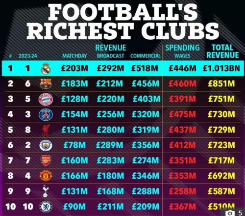 利物浦是英超唯一進(jìn)入收入前五的球隊(duì),皇家馬德里成為首支收入突破10億英鎊的俱樂部,緊隨其后的是巴塞羅那、拜仁慕尼黑和巴黎圣日耳曼。