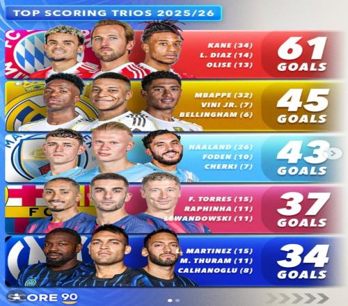 體育播報1月24日宣 數(shù)據(jù)網(wǎng)站Score90盤點了本賽季五大聯(lián)賽球隊進攻三叉戟在各項賽事進球榜,具體如下: