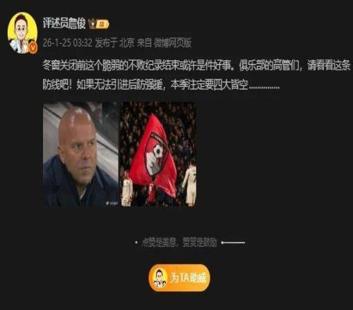 北京時間1月25日,英超第23輪,利物浦客場2-3慘遭伯恩茅斯絕殺,進(jìn)入2026年以來英超還未贏過。本場比賽,利物浦在客場一度0-2落后對手,但靠著范戴克的角球破門和索博的80分鐘的任意球破門一度扳平比分。比賽90+4分鐘,伯恩茅斯利用界外球機(jī)會,由阿德利打入制勝一球。最終,伯恩茅斯3-2絕殺利物浦,終結(jié)對手各項賽事13場不敗的紀(jì)錄。